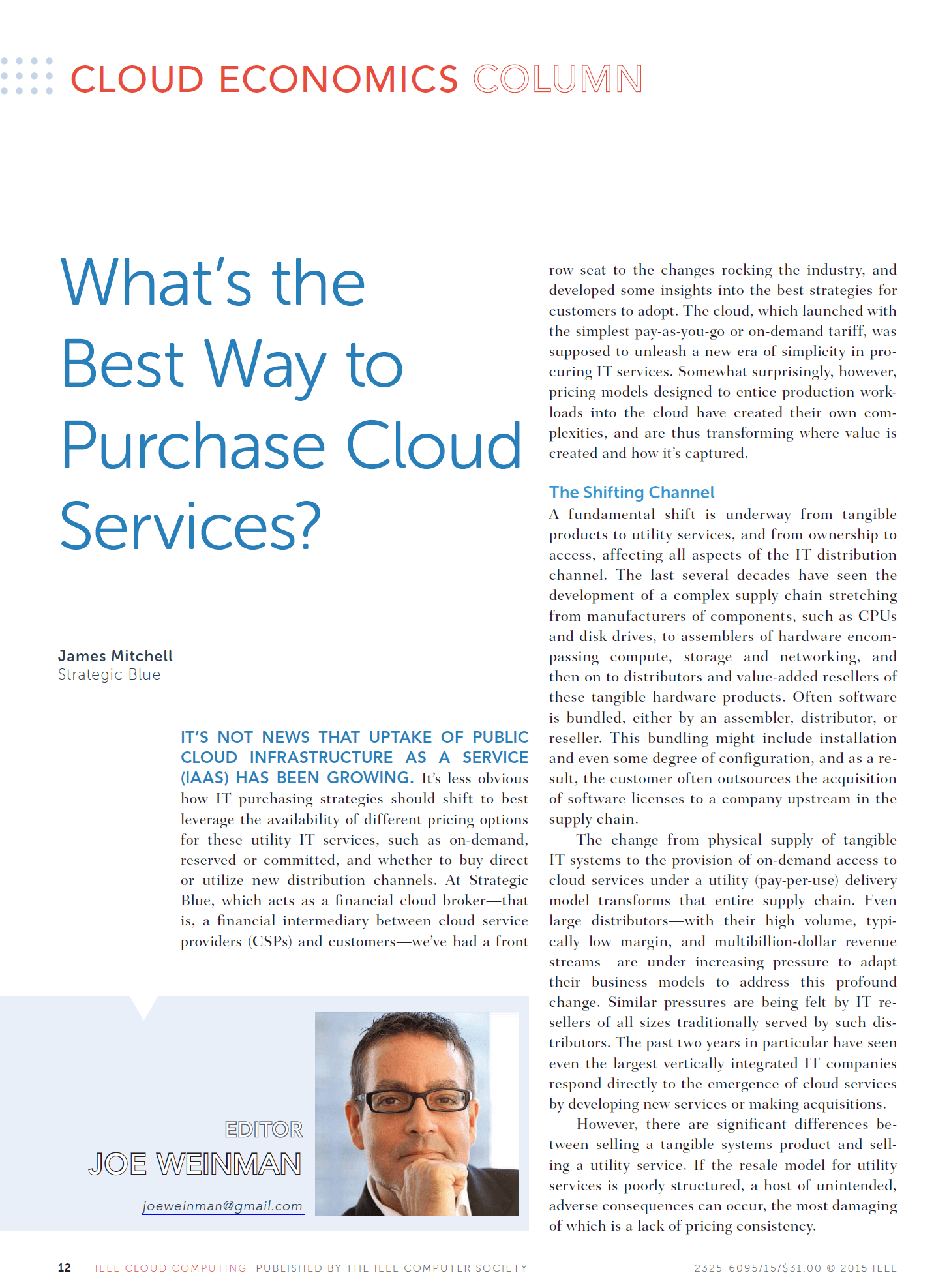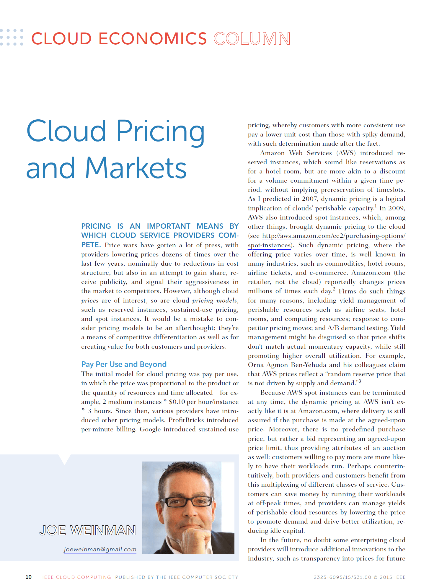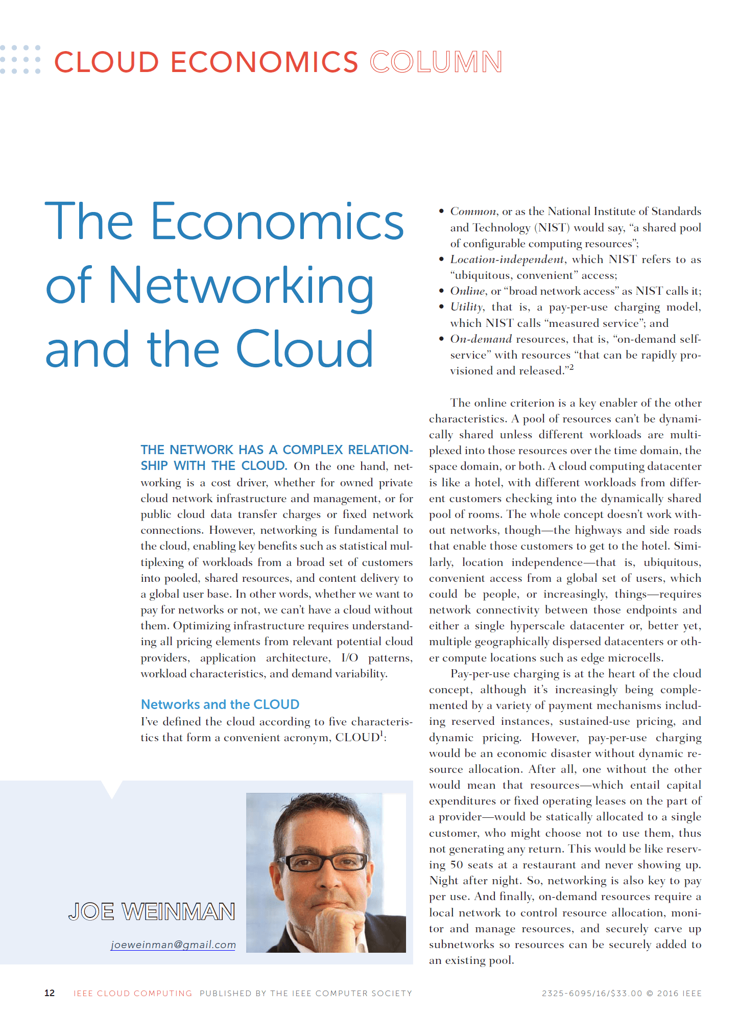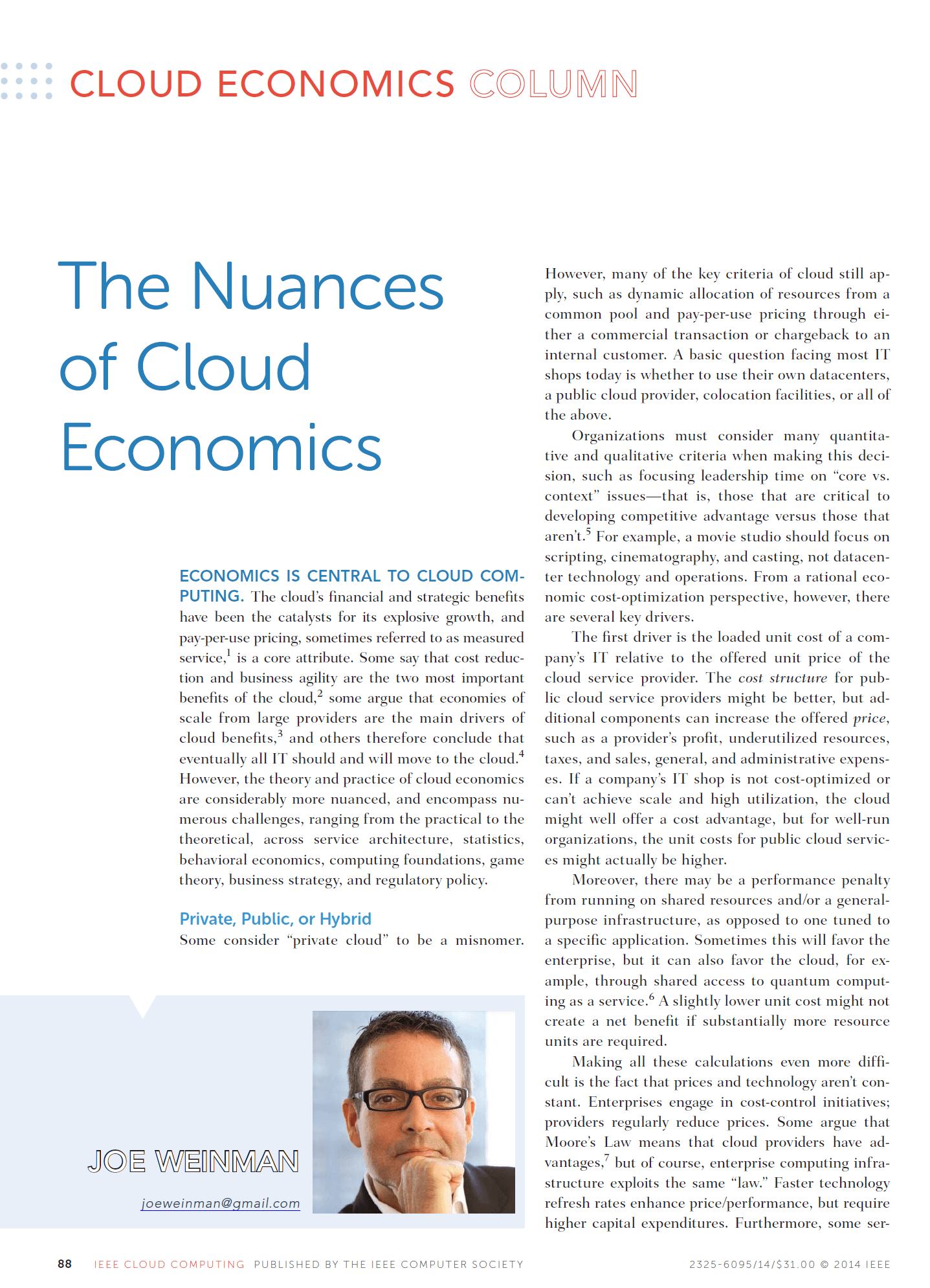 Joe Weinman's articles have appeared in leading business and technology magazines such as the Harvard Business Review, IEEE Computing Edge, the Journal of Software Technology, Business Communications Review, Global Telecoms Business, BillingOSS Magazine, Interglobix, China Policy Review, the AT&T Technical Journal, Entrepreneur, and IEEE Cloud Computing, where he was the Cloud Economics editor for its entire five year existence. They have also appeared in various corporate magazines, such as for Dassault Systèmes, HP, Huawei, and Lucent.