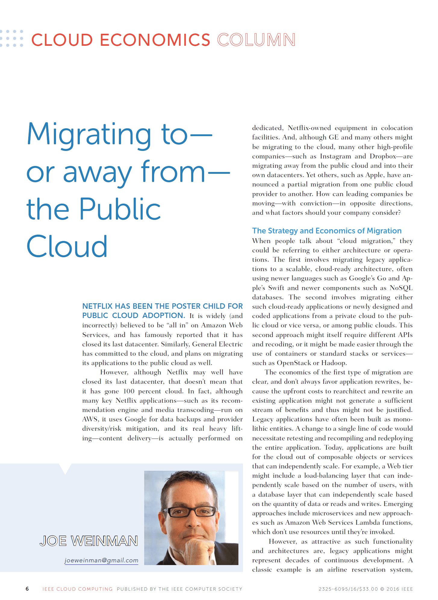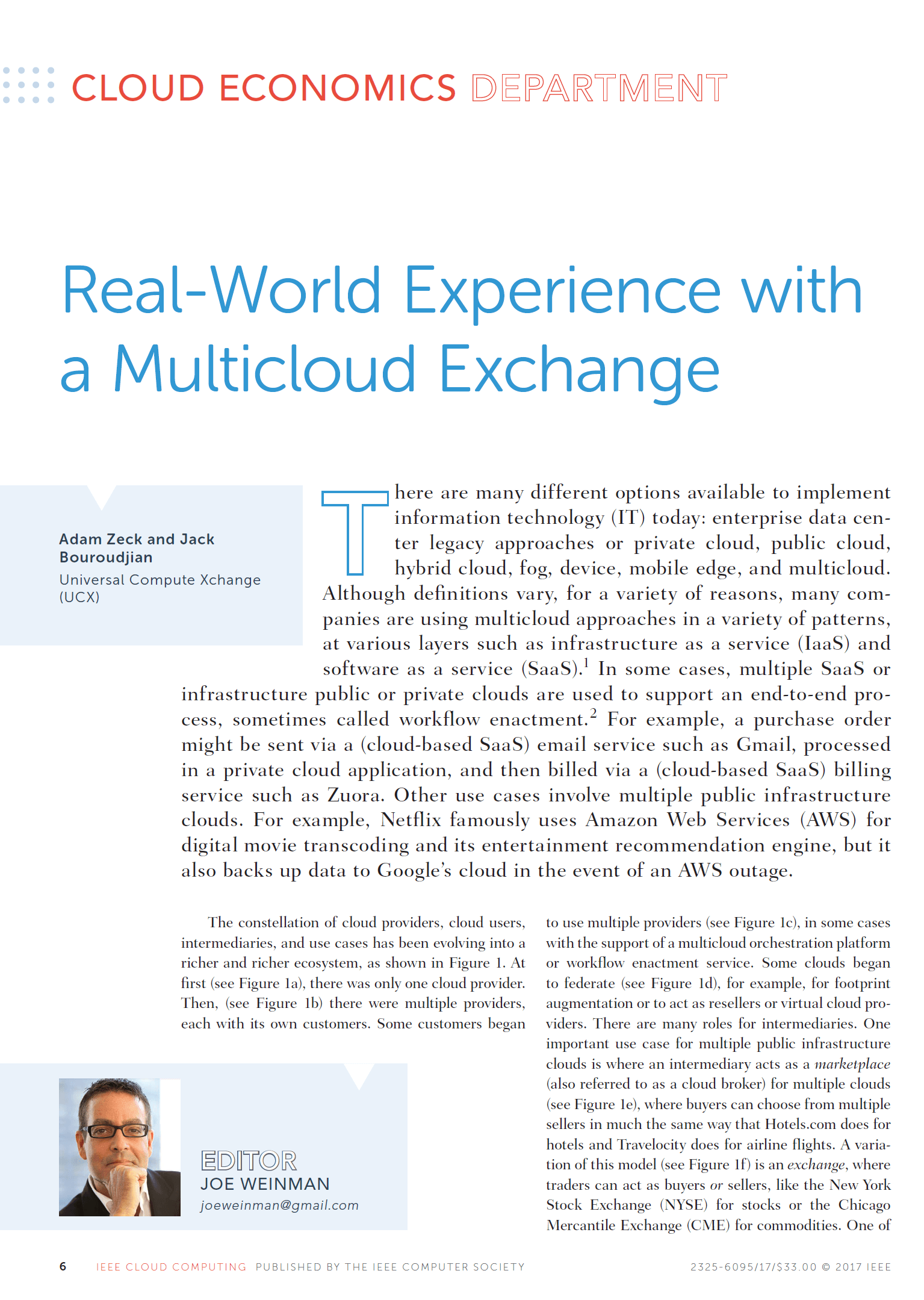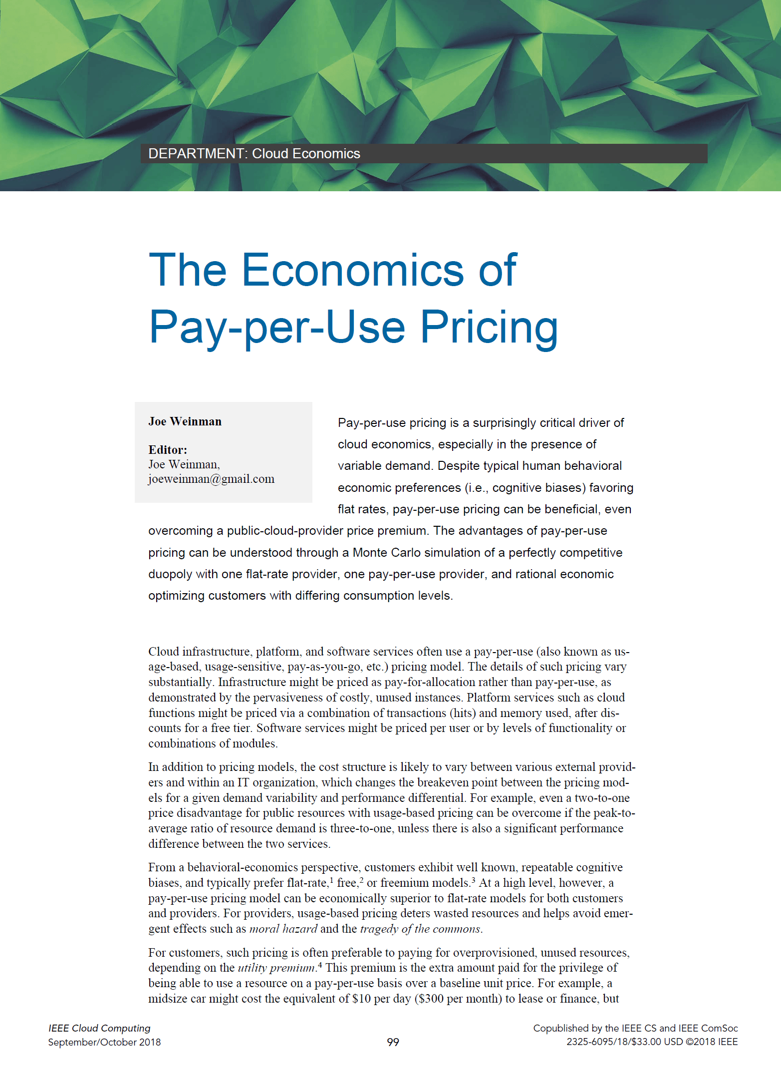 Joe Weinman's articles have appeared in leading business and technology magazines such as the Harvard Business Review, IEEE Computing Edge, the Journal of Software Technology, Business Communications Review, Global Telecoms Business, BillingOSS Magazine, Interglobix, China Policy Review, the AT&T Technical Journal, Entrepreneur, and IEEE Cloud Computing, where he was the Cloud Economics editor for its entire five year existence. They have also appeared in various corporate magazines, such as for Dassault Systèmes, HP, Huawei, and Lucent.