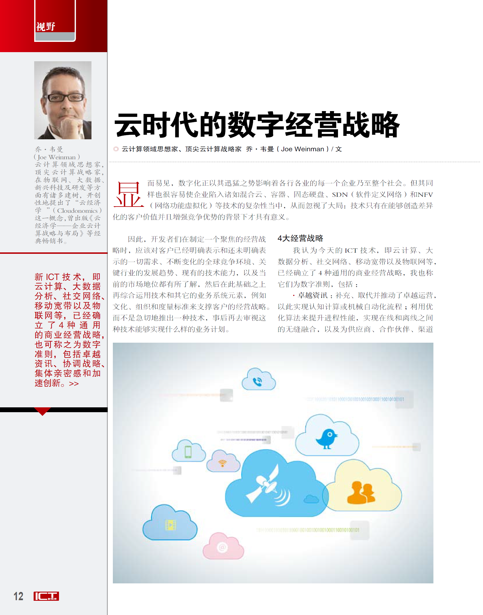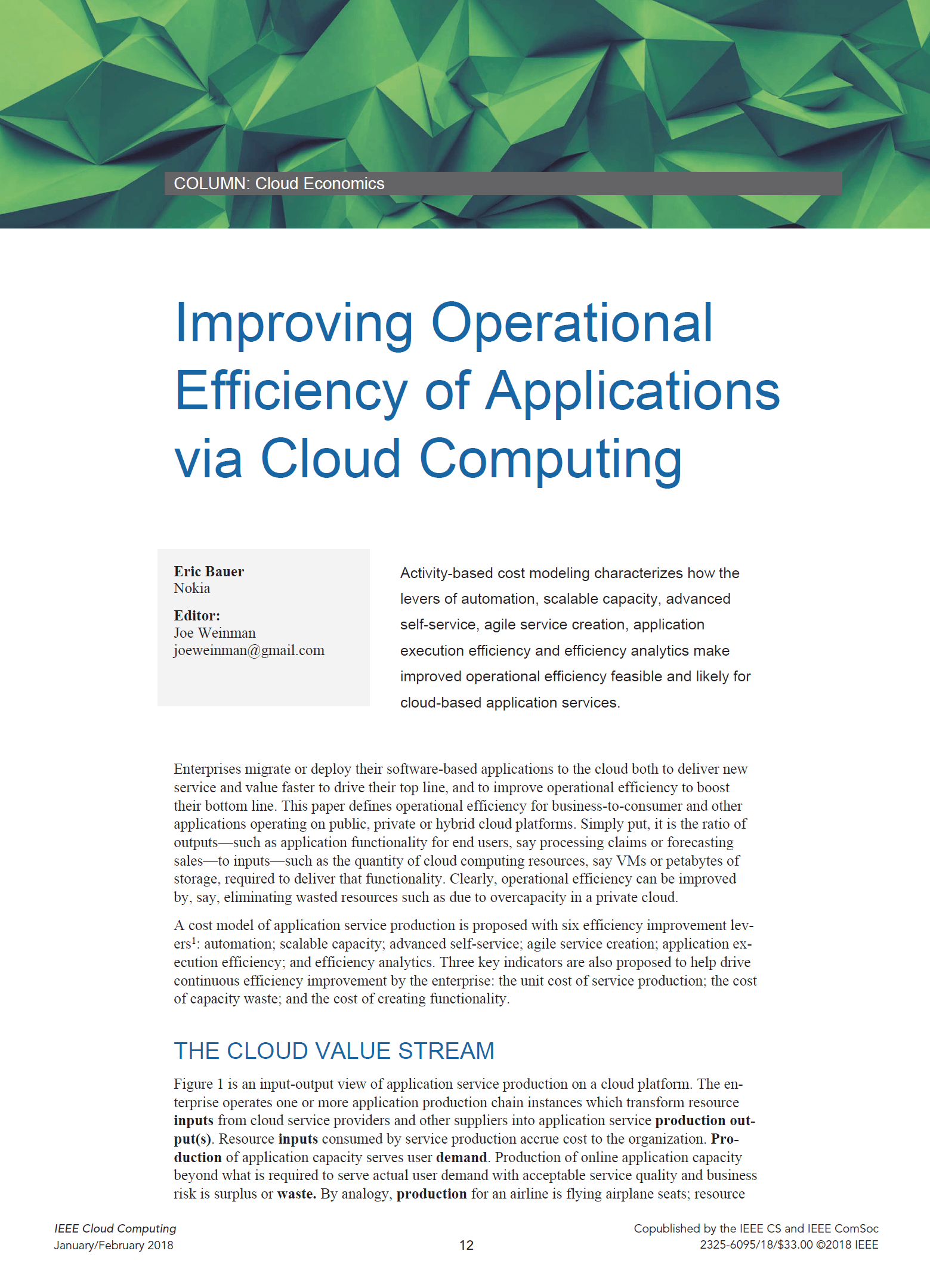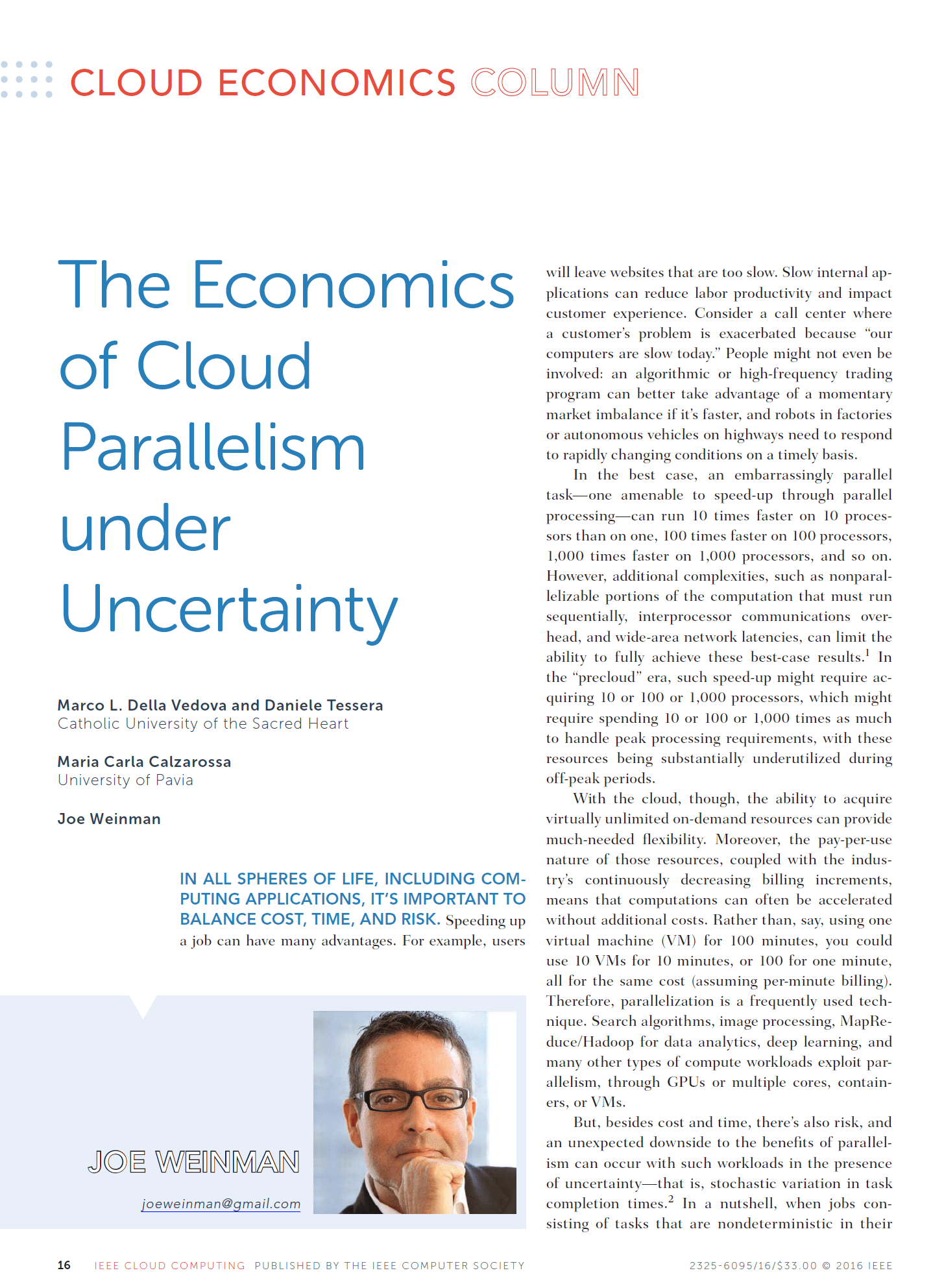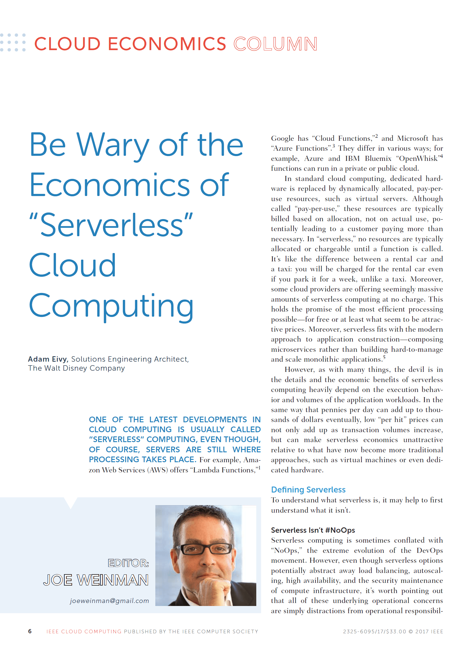 Joe Weinman's articles have appeared in leading business and technology magazines such as the Harvard Business Review, IEEE Computing Edge, the Journal of Software Technology, Business Communications Review, Global Telecoms Business, BillingOSS Magazine, Interglobix, China Policy Review, the AT&T Technical Journal, Entrepreneur, and IEEE Cloud Computing, where he was the Cloud Economics editor for its entire five year existence. They have also appeared in various corporate magazines, such as for Dassault Systèmes, HP, Huawei, and Lucent.